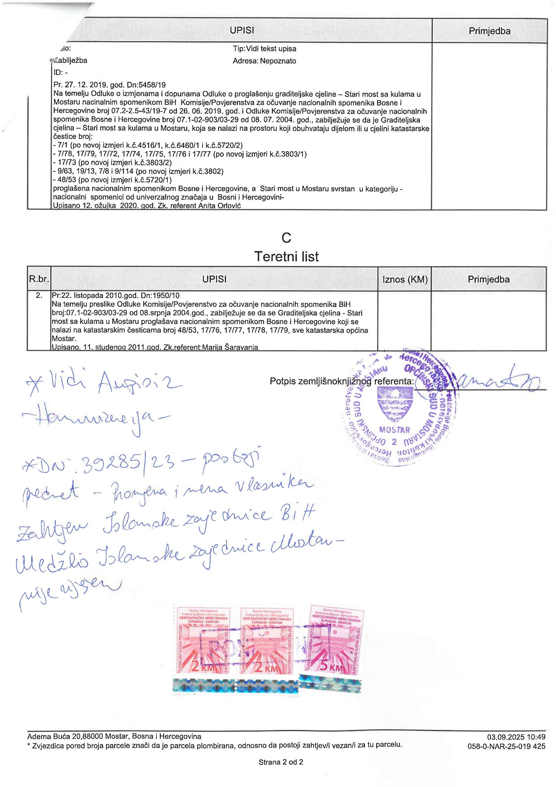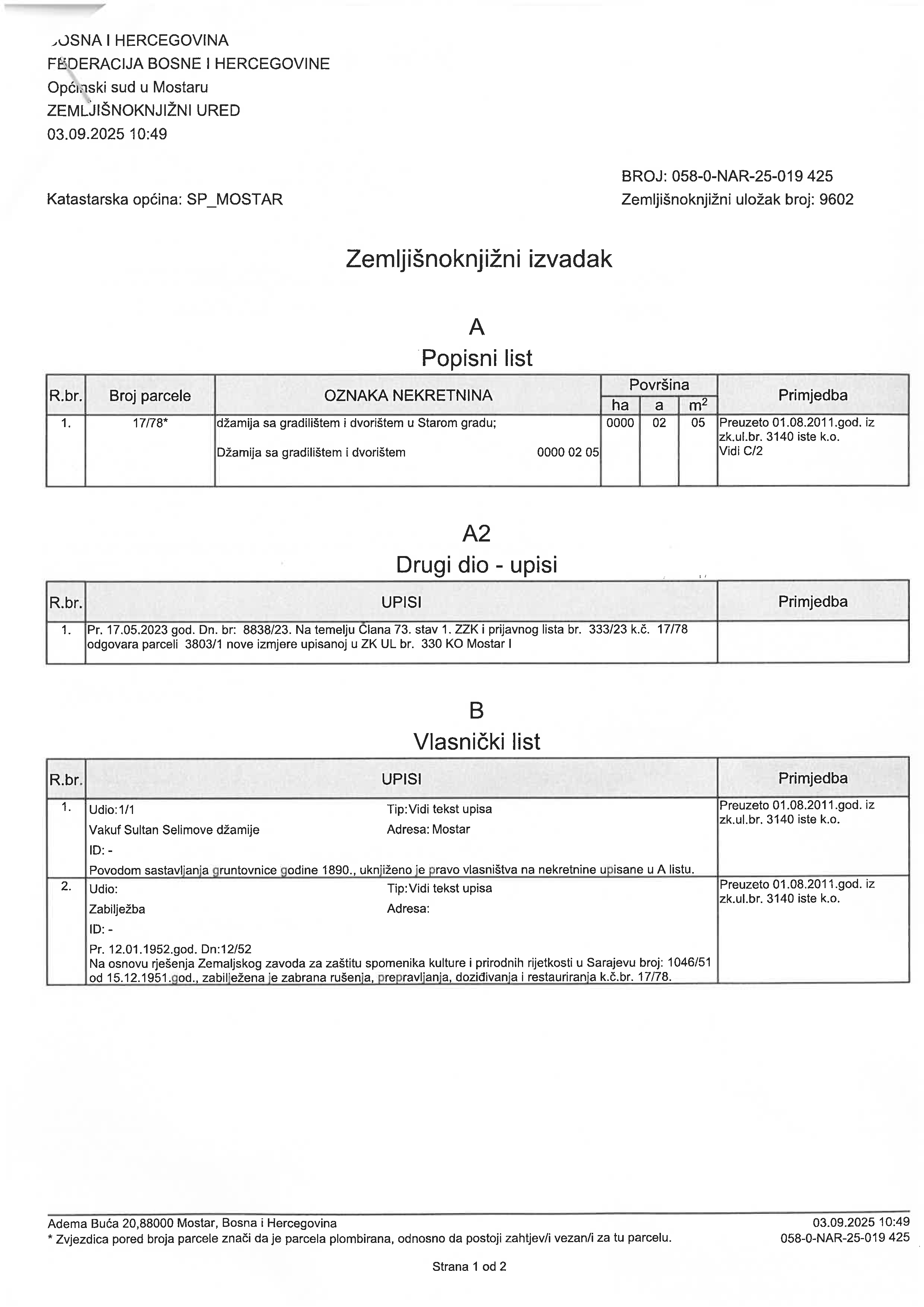 Uz saopćenje za javnost prilažemo i Z K izvadak izdat od strane Zemljišno knjižnog ureda u Mostaru na dan 3.9.2025. godine.