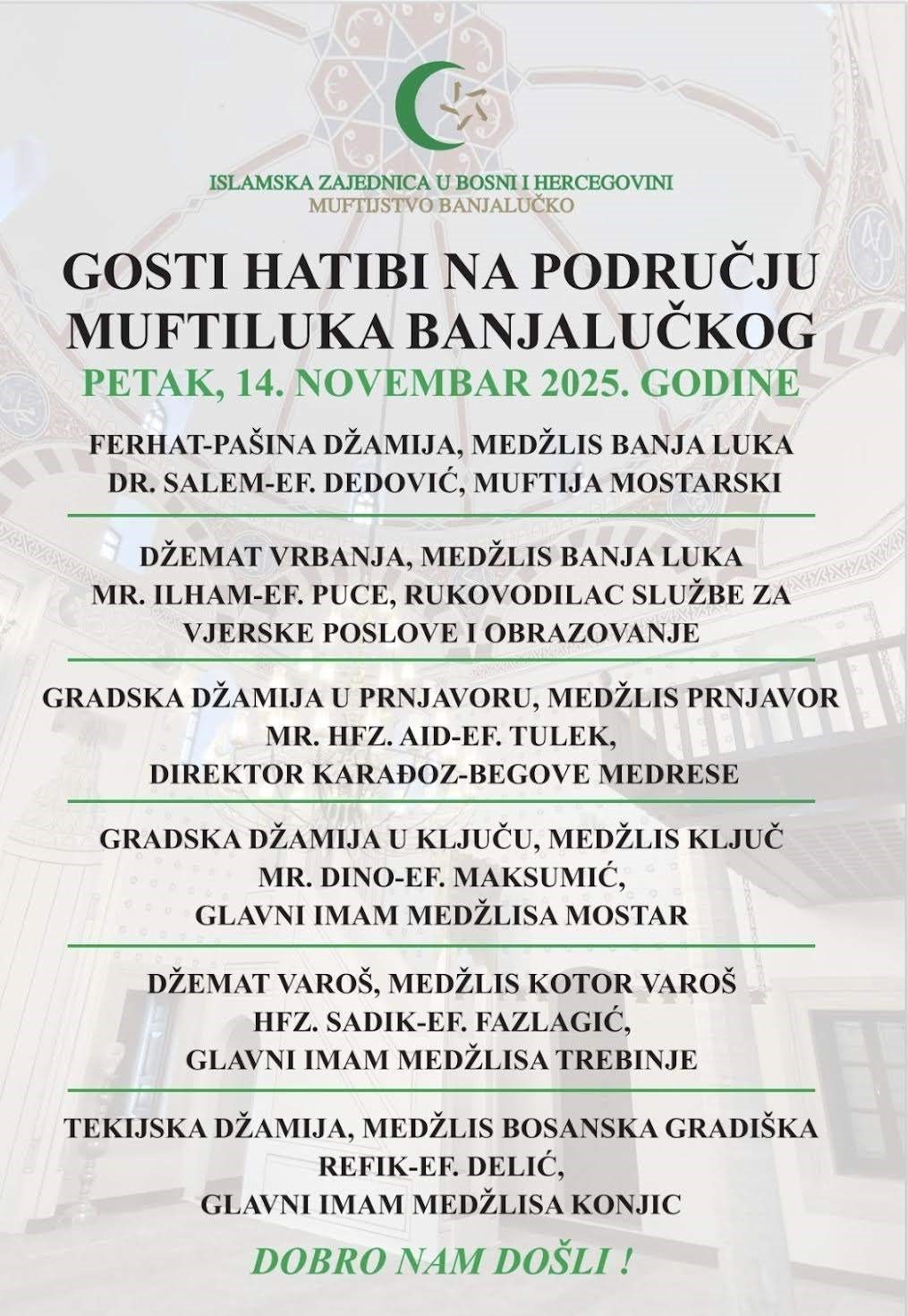 U petak, 14. novembra 2025. godine, u posjeti Muftijstvu banjalučkom boravit će delegacija Muftijstva mostarskog predvođena dr. Salem-ef. Dedovićem, muftijom mostarskim.
